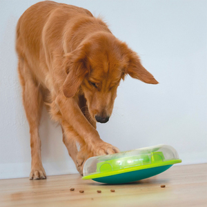 Cómo jugar: Llena el Wobble Bowl con las croquetas o las golosinas favoritas de tu perro quitando el tapón en la parte superior de la tapa y vertiendo la comida. Vuelve a colocar el tapón en la tapa y ¡que comiencen los juegos! Para los principiantes, enséñele a tu perro cómo mecer y balancear el cuenco para sacar la comida. Lavar a mano con agua y jabón después de vaciar el alimento.