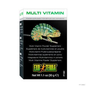 El Suplemento en Polvo Multivitaminas Exo Terra es un alimento complementario formulado para alcanzar la necesidades nutricionales de reptiles y anfibios en conjunto con su dieta diaria. Este contiene los niveles precisos de vitaminas, amino ácidos y elementos trazas que son esenciales para la producción de energía, crecimiento, mantenimiento, reproducción y muchas otras funciones fisiológicas. La mayoría de los reptiles y anfibios son incapaces de obtener las vitaminas esenciales y minerales trazas que ellos requieren de su dieta en cautiverio.