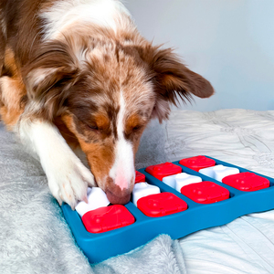 Coloca los premios dentro de los compartimentos. Tapa con los huesitos y las tapas de los compartimentos. Tu perro debe quitar los huesos, abrir las tapas y deslizar los cajones para obtener todos los premios.