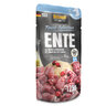 Carne, corazón, hígado de pato (34 %); carne, hígado, panza, pulmón y corazón de cordero (31 %); caldo de carne de pato y cordero (27,5 %); arroz, cocido (4 %); arándanos (2 %); aceite de cardo (0,5%); cáscaras de huevo, secas (0,5 %); minerales (0,5 %).